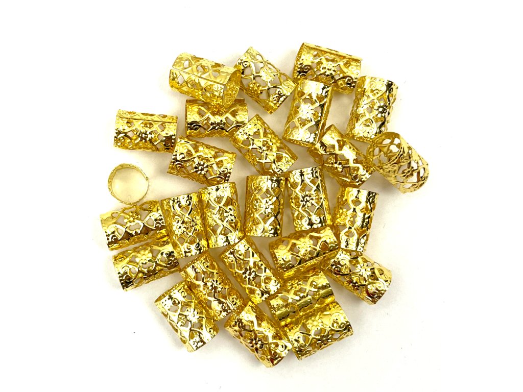Beads for dreadlocks or braids with adjustable diameter. The beads are made of aluminium and are easily flexible. Hole size 10mm x 15mm length. Package contains 27pcs of gold beads.