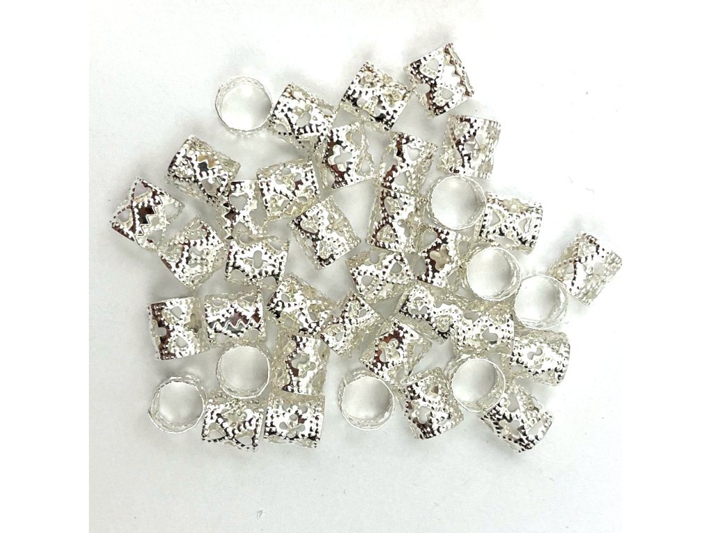Beads for dreadlocks or braids with adjustable diameter. The beads are made of aluminium and are easily flexible. Hole size 8mm x 10mm length. Package contains 39pcs of silver beads.