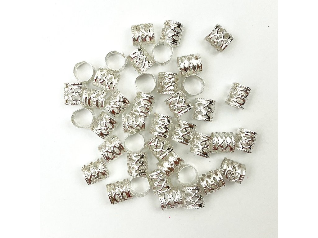 Beads for dreadlocks or braids with adjustable diameter. The beads are made of aluminium and are easily flexible. Hole size 10mm x 10mm length. Package contains 42pcs of silver beads.