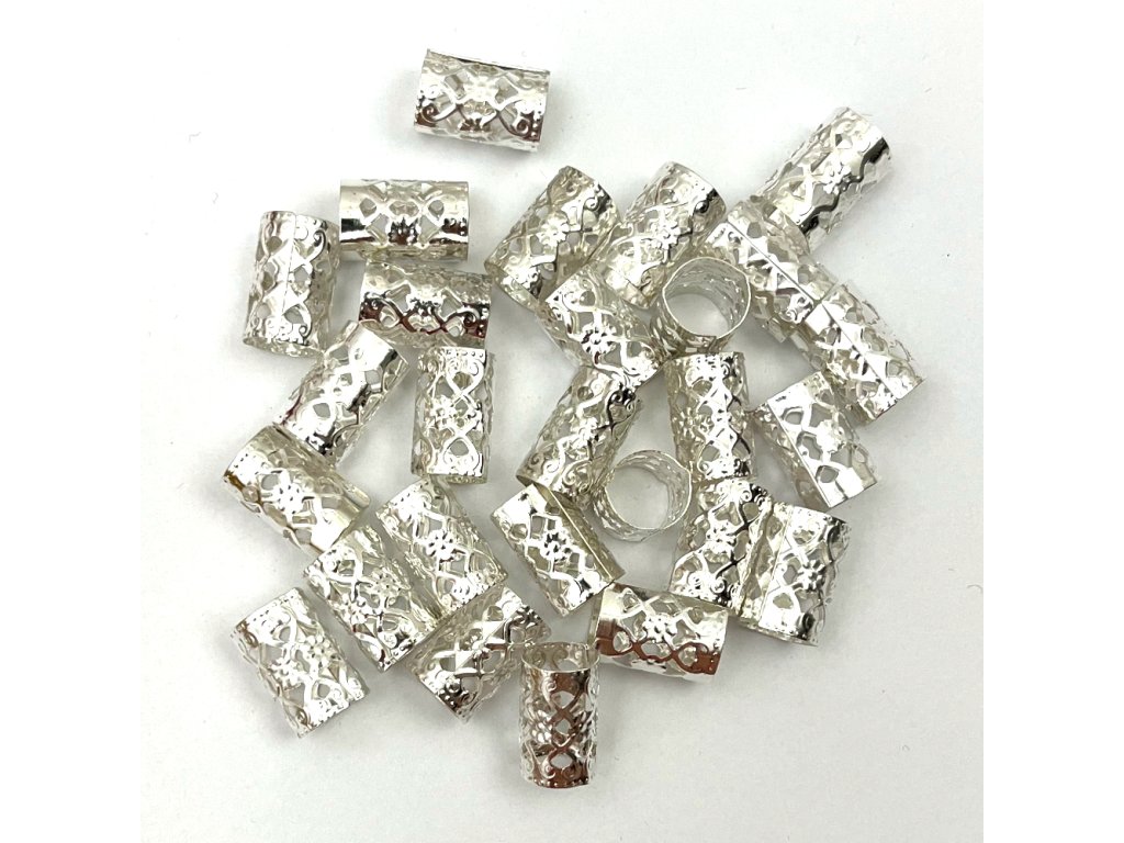 Beads for dreadlocks or braids with adjustable diameter. The beads are made of aluminium and are easily flexible. Hole size 10mm x 15mm length. Package contains 27pcs of silver beads.