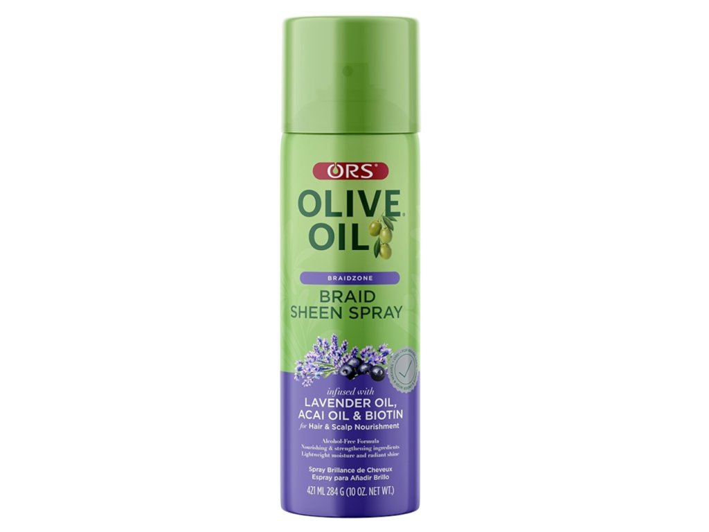 Give your braids, twists, dreads or extensions shine, hydration and freshness with ORS Olive Oil Braid Sheen Spray. Enriched with olive oil, lavender oil, acai oil and biotin, this nourishing spray gives hair instant vibrancy, softness and a healthy look without weighing it down or leaving a greasy film.