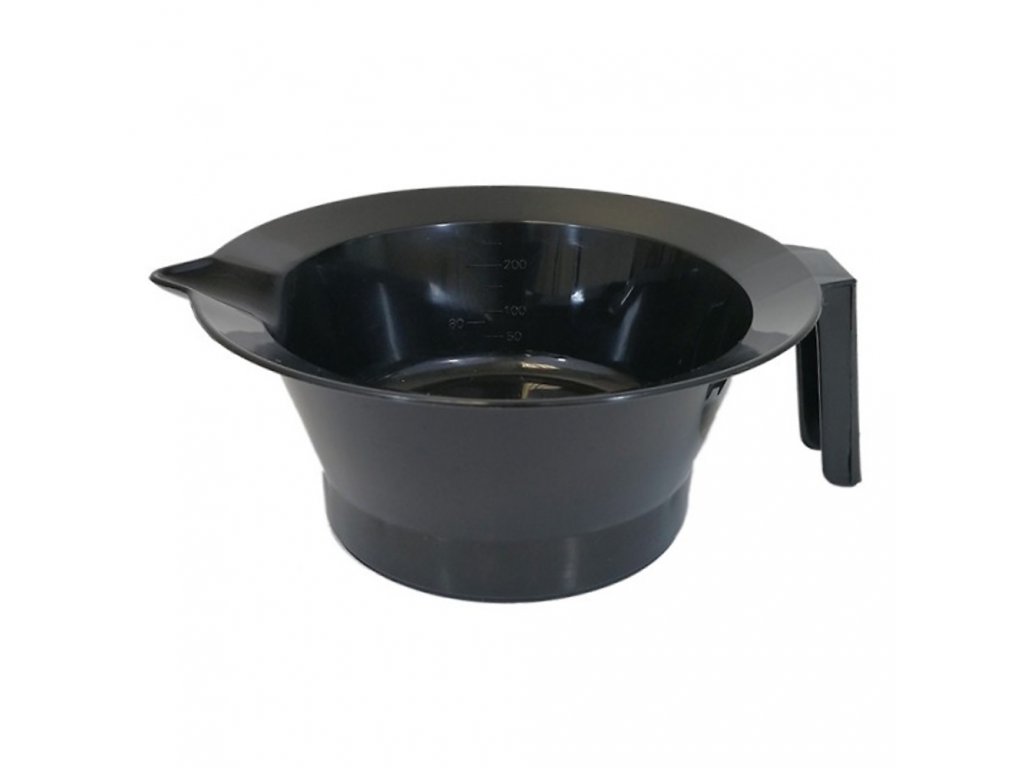 Plastic bowl for hair colouring with non-slip ring, measuring scale and handle.