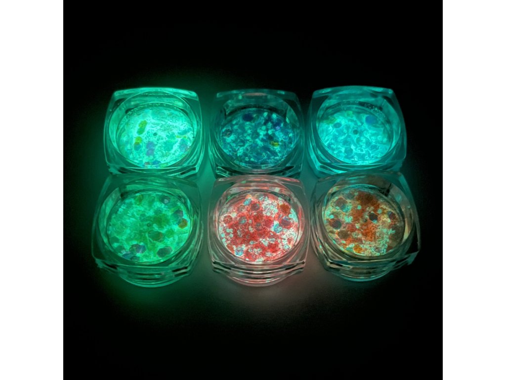 Glitter for face and body to create a unique glitter effect. Mix of sizes. Glow in the dark. Can be applied with face cream products, eyelash glue or hair gels.