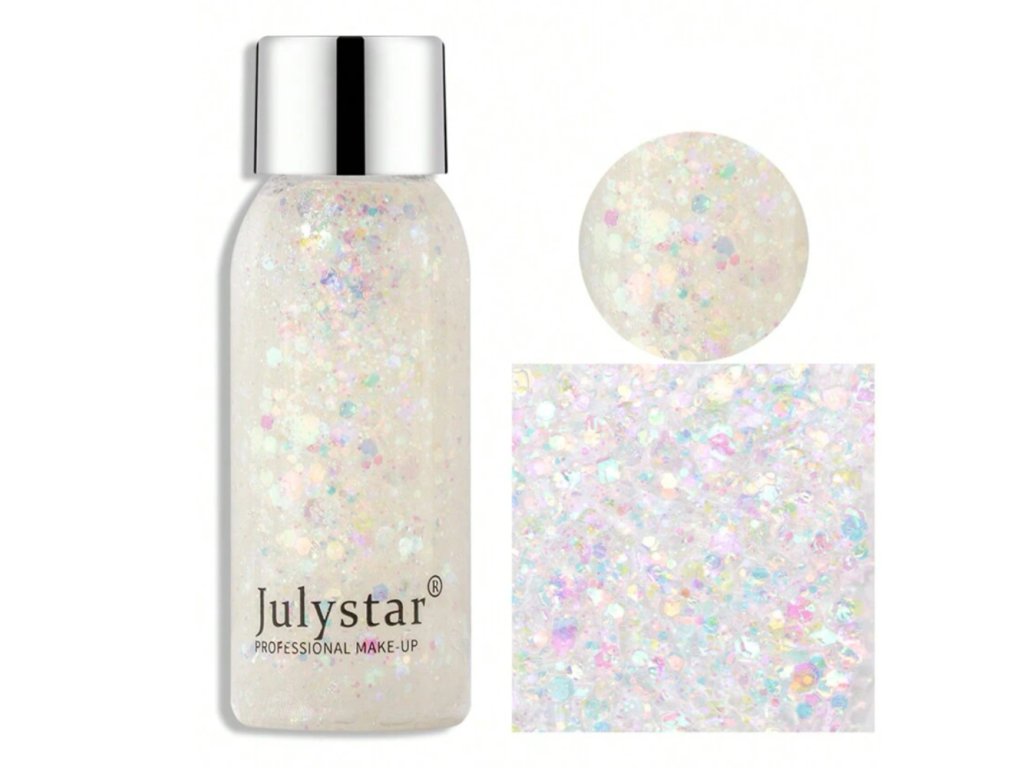 Silver glitter body gel for a shimmering effect. The gel can also be applied to the hair to revive the hairstyle. Apply with fingertips, sponge or brush. Easily remove with lukewarm water and soap or wipe off with cosmetic wipes. Extend the life of the product by closing the bottle early. Applicator included.