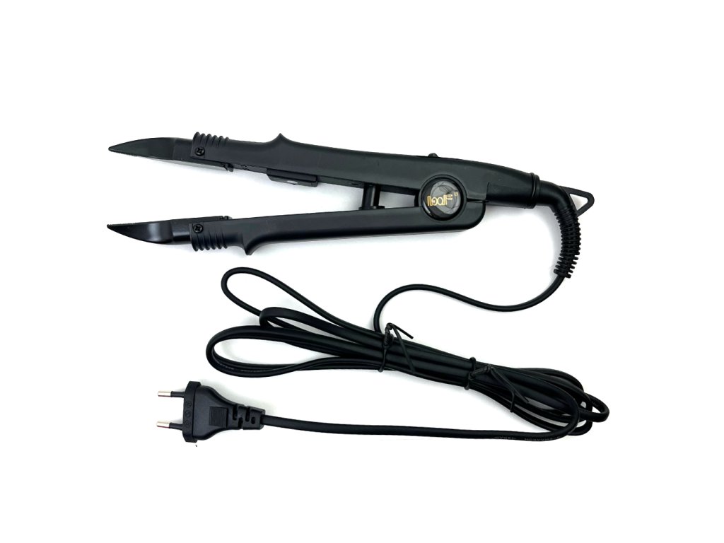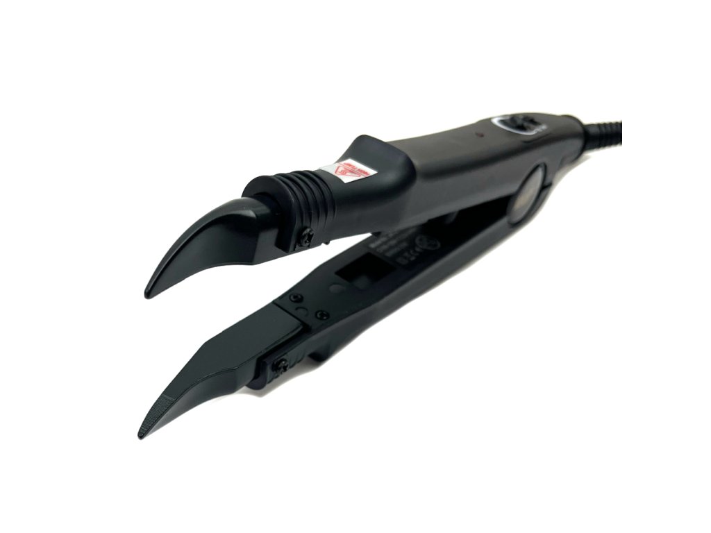 Fusion tongs for keratin with temperature control in the range of 100°-210°C for the application of strands using the Keratin method. The fusion pliers are also used to detangle hair and create strands for the Keratin or Micro Ring method. The pliers have curved fusing jaws. The colour of the pliers is black. The temperature control is located directly on the pliers.