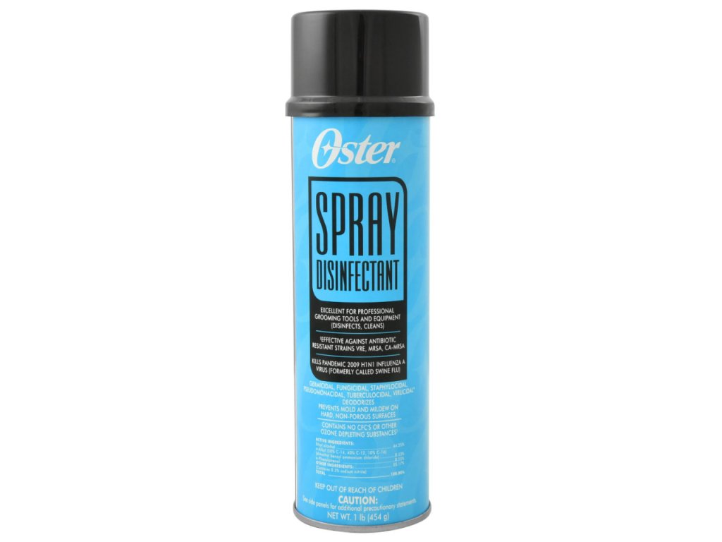 Oster Disinfectant Spray deodorizes hard surfaces and kills most bacteria and mold.
