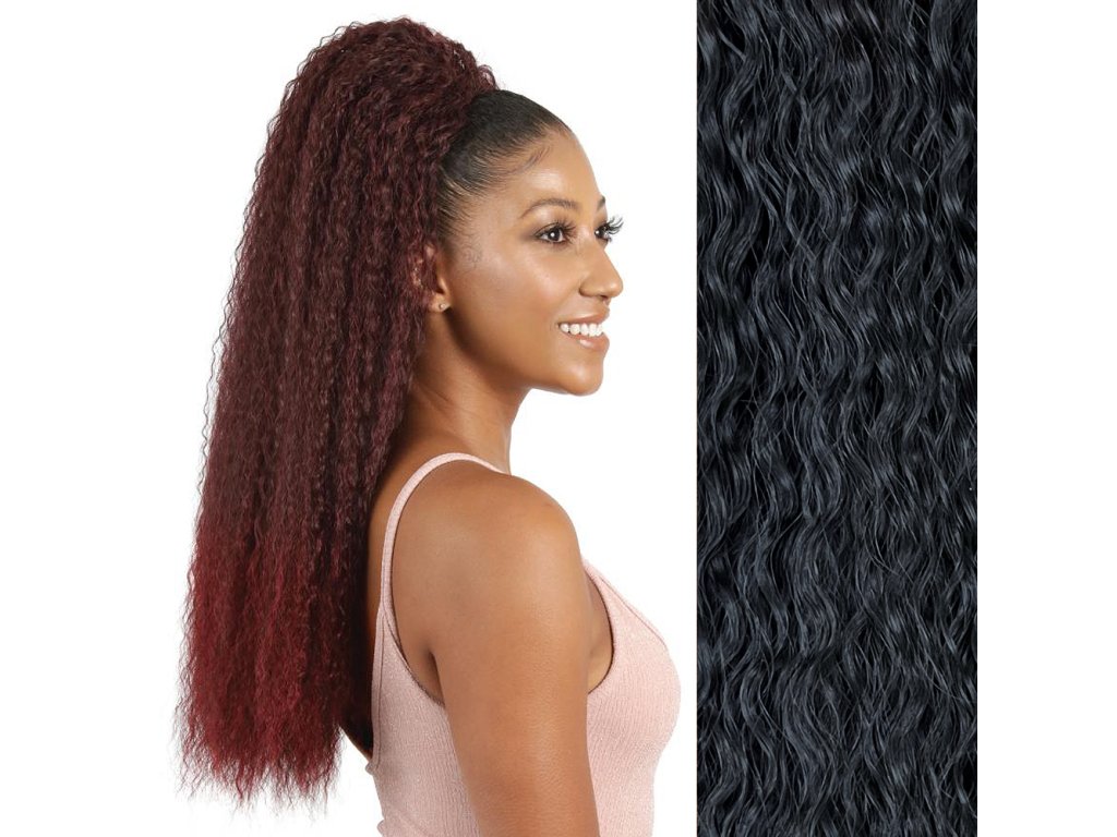 Clip-in ponytail is made out of kanekalon and it is 60cm long. This hairpiece gets fixed with a tightening band. The fiber is flame-retardant and you can style it with heat up to 130C.