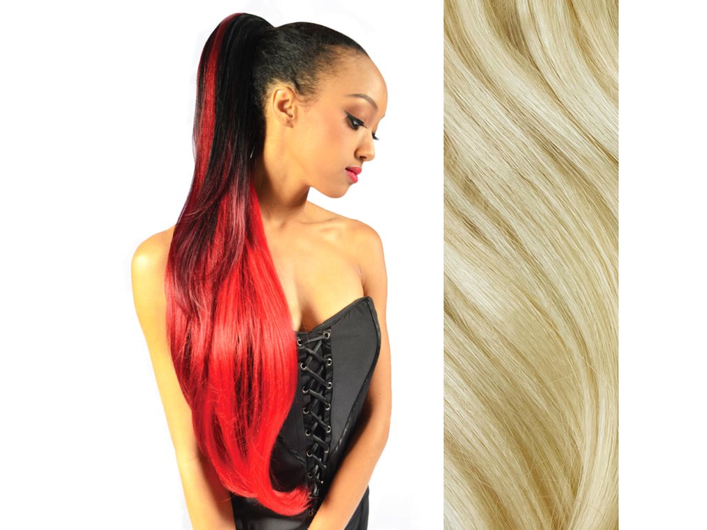 Clip-in ponytail is made out of kanekalon and it is 60cm long. This hairpiece gets fixed with a band. The fibre is flame-retardant and you can style it with heat up to 150C.