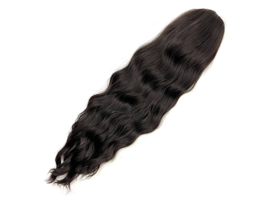 Wavy ponytail on a drawstring 60cm long. Approximate weight of ponytail is 200gr. Easy to put on by tightening the elastic band. The fibre can be heat treated up to 180-200C.