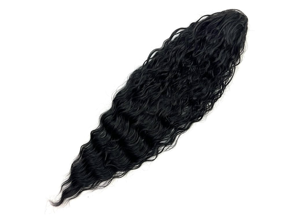 Wavy ponytail on a drawstring 70cm long. Approximate weight of ponytail is 200gr. Easy to put on by tightening the elastic band. The fibre can be heat treated up to 180-200C.