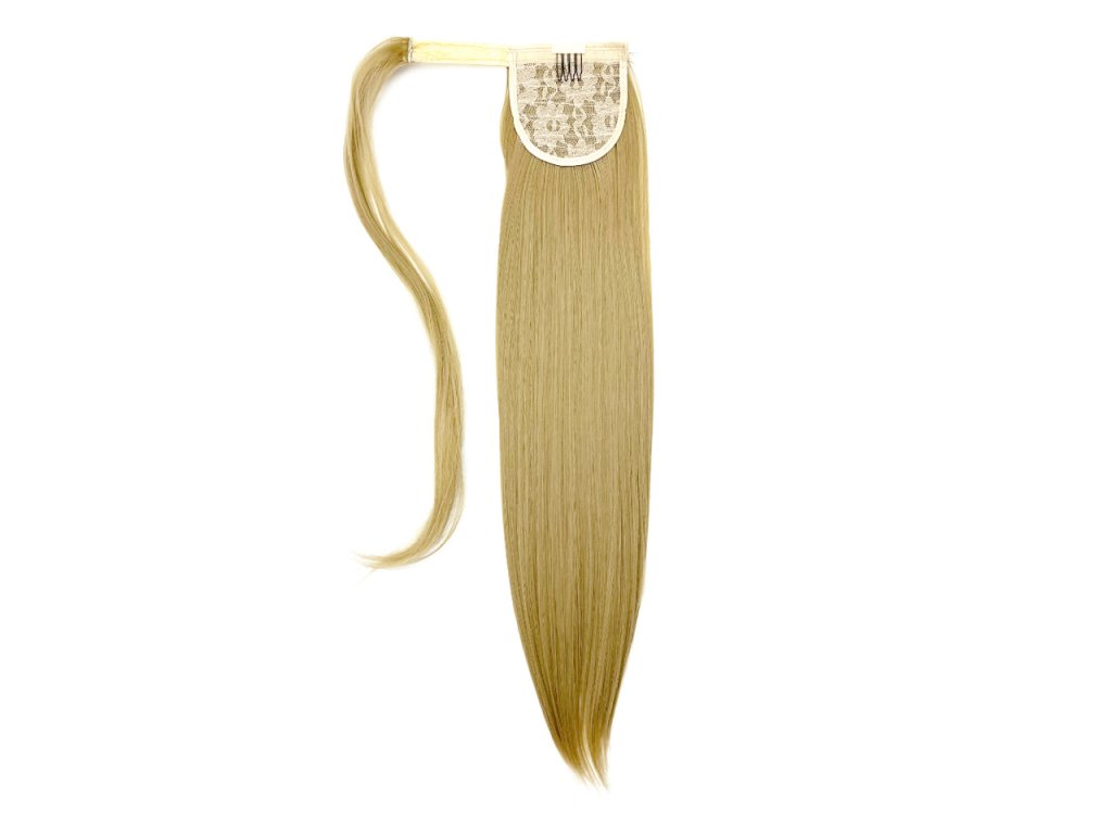 Clip-on ponytail made of artificial hair 60cm long 120gr. Fastening with a clip and covering the joint with a velcro strand.