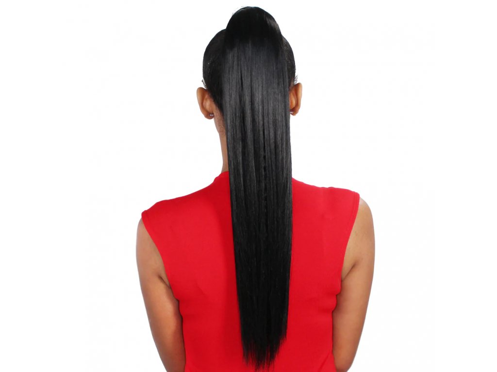 Clip-in ponytail is made out of kanekalon. It is 60cm long and it weighs around 120gr. This hairpiece gets fixed with a clip and a loose strand of hair with a velcro that hides the fixing when styled. The fibre is flame-retardant and you can style it with heat up to 130C.