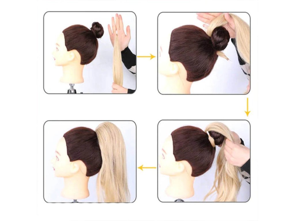 Setting ponytail with curled end and special setting tip. With this hairpiece you can quickly and easily extend your ponytail and achieve a natural look. Can be used for a high ponytail, a low ponytail or a voluminous bun.