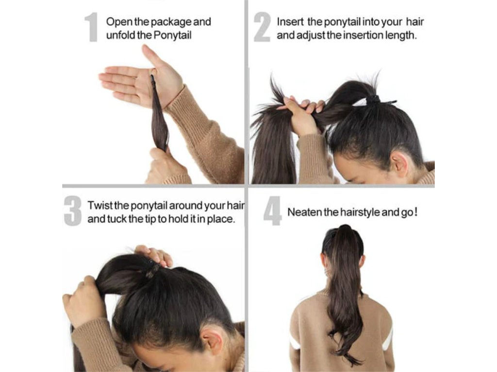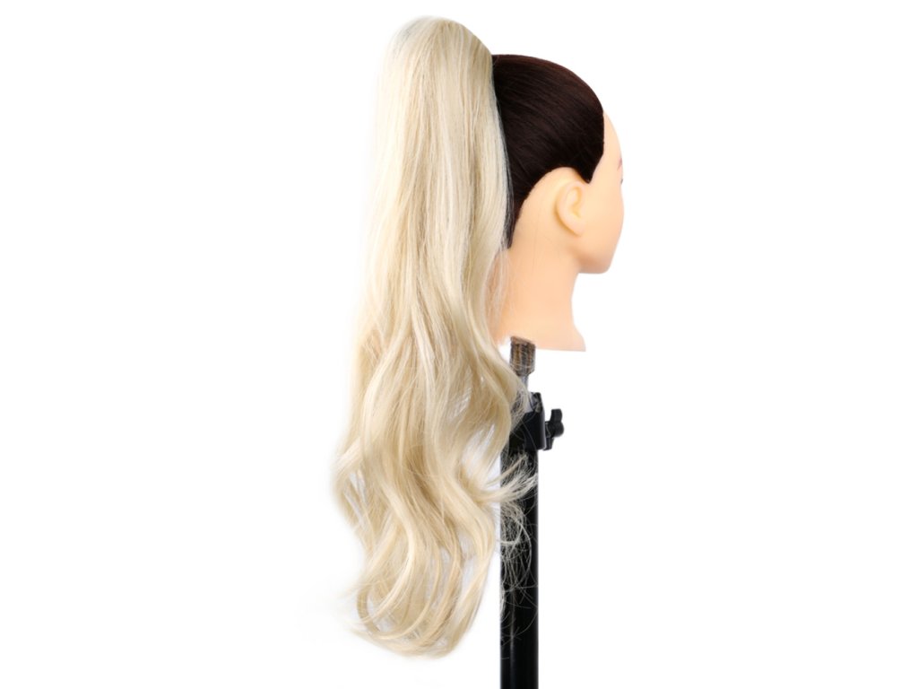 Setting ponytail with curled end and special setting tip. With this hairpiece you can quickly and easily extend your ponytail and achieve a natural look. Can be used for a high ponytail, a low ponytail or a voluminous bun.