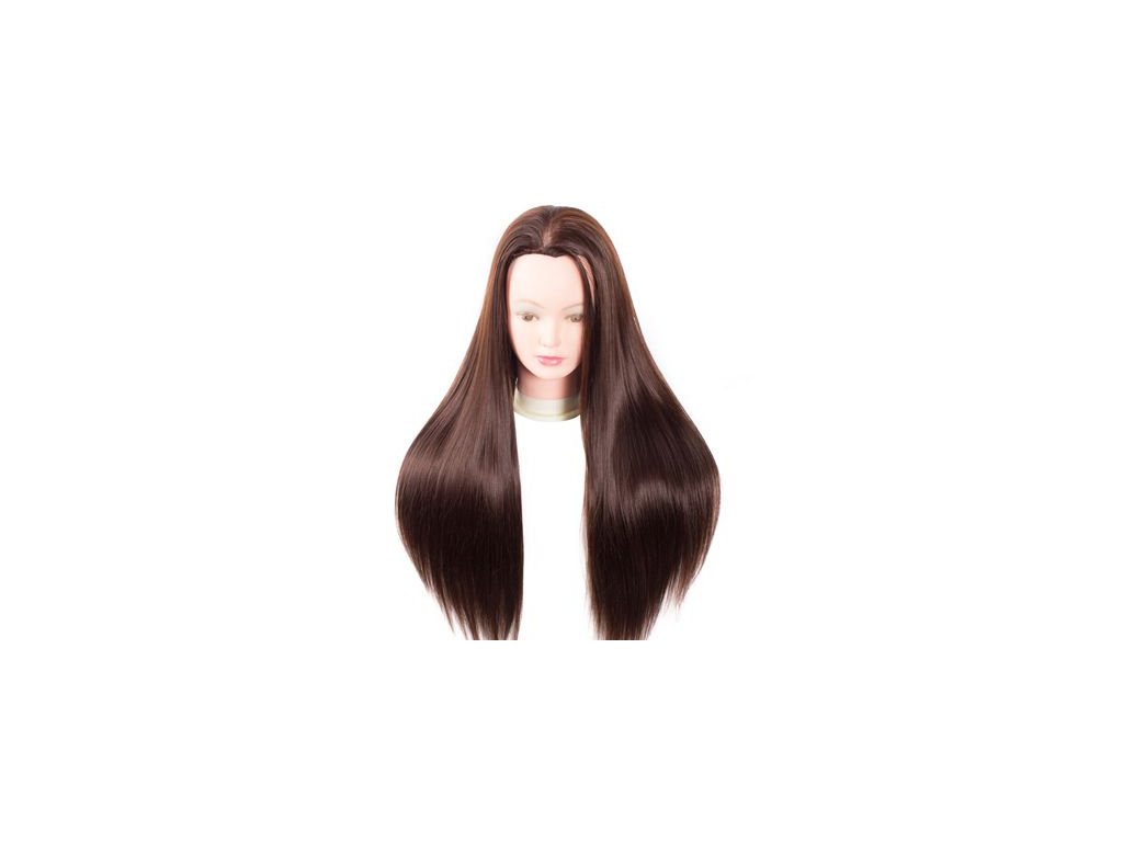 Training head made of synthetic hair suitable for practicing hair extensions, braiding, creating hairstyles or cutting. Hair color is dark brown and the length is 60cm.
